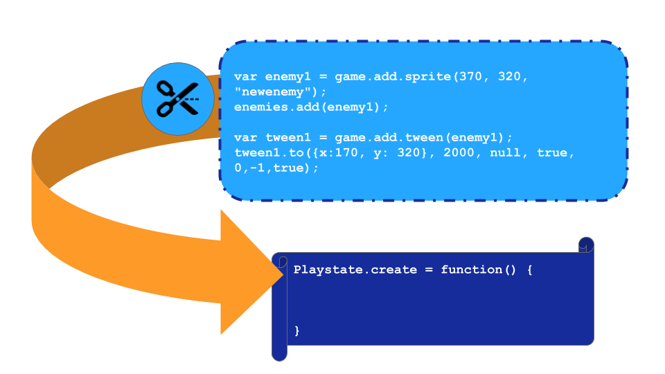 The tween code above will move our enemy to the position 170 pixels in from the left and 320 pixels down from the top, and it will take two seconds (2000 miliseconds) after the game starts. When it gets there it will move back and not stop doing it. Have a play with those figures to get the effect you want and to place your enemy where you want it to appear.