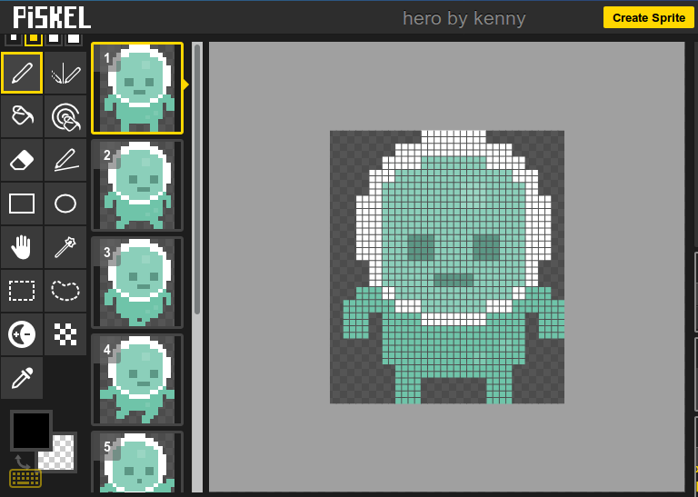 Another way to make our player face the direction that they are moving is to create your animation so that it has frames which point the other direction. There is a Flip tool which lets you do that in Piskel (on the right with 2 tall triangles).